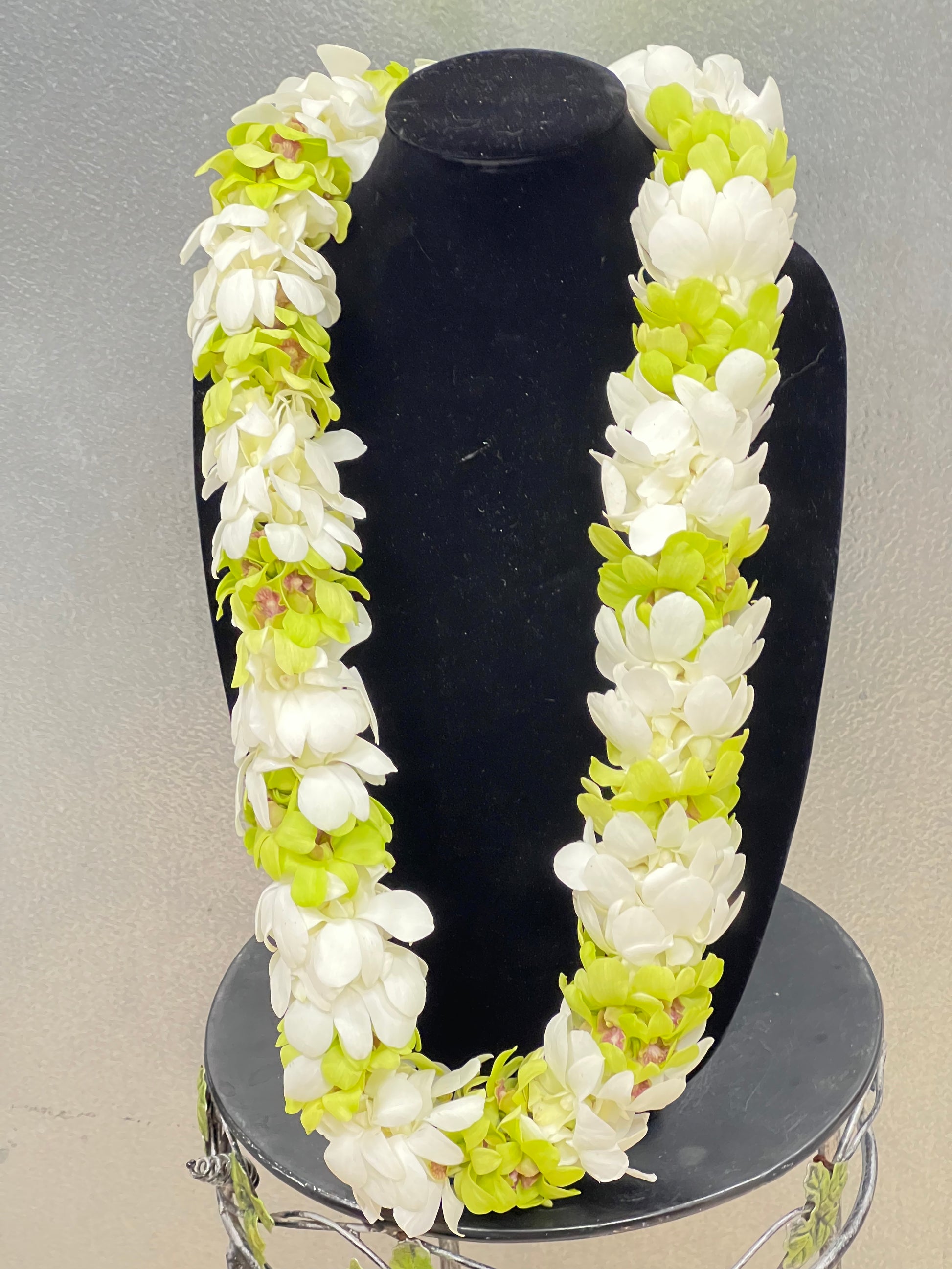 Graduation leis, Triple Fresh cut orchids Leis in a clear container, ribbon and greeting card