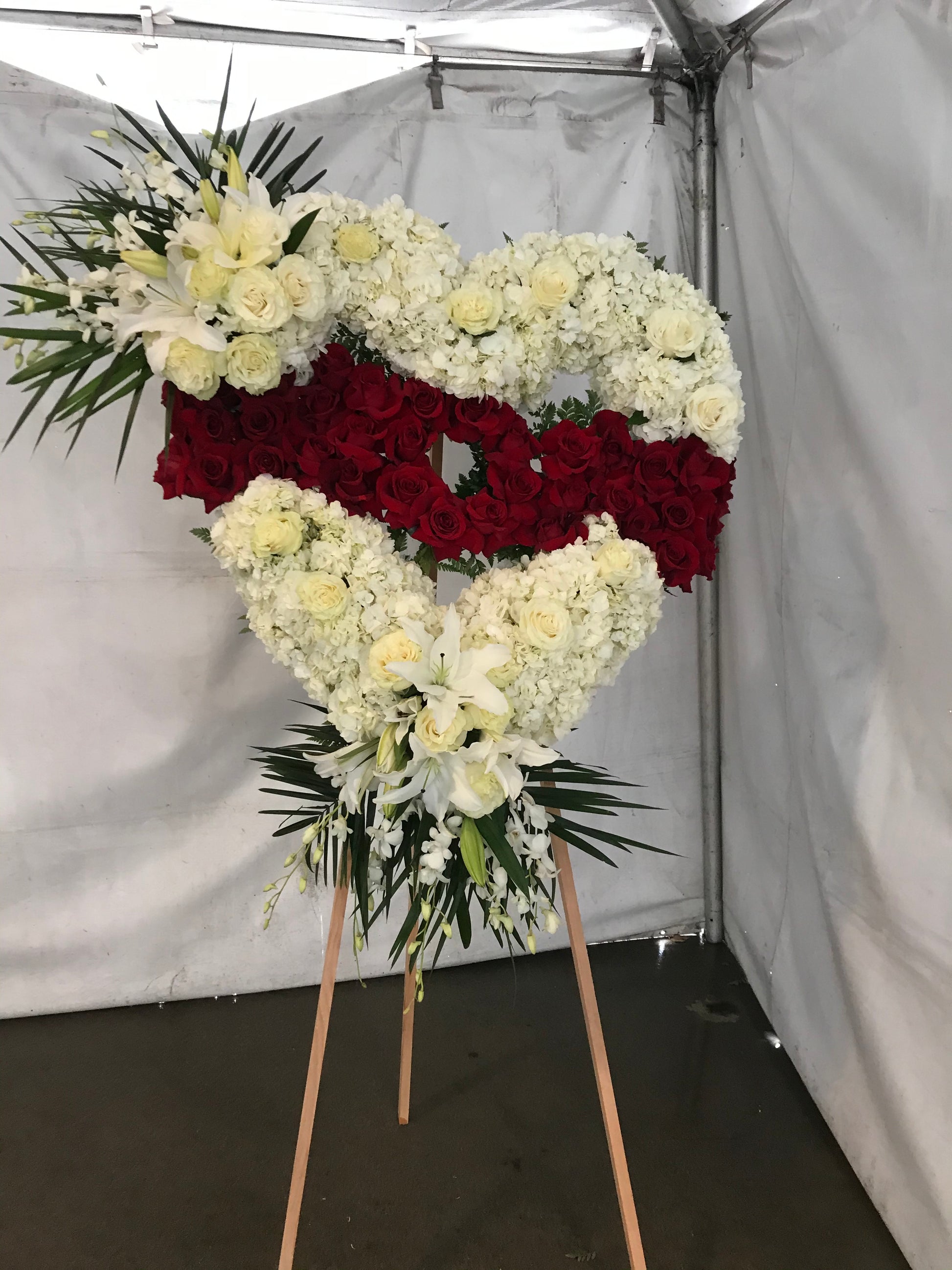 A heartfelt expression of love and compassion, the Gentle Embrace Heart is a stunning arrangement that offers comfort and solace during times of mourning. White orchids, lilies, roses, hydrangea, and red roses intertwine with leather leaf and palm leaves, creating a captivating display of color and texture. This large heart-shaped arrangement is suitable for funeral home or cemetery services, serving as a poignant reminder of the enduring bond between loved ones. Its contrasting hues of red and white symbolize the duality of grief and cherished memories, providing a gentle embrace during the journey of healing