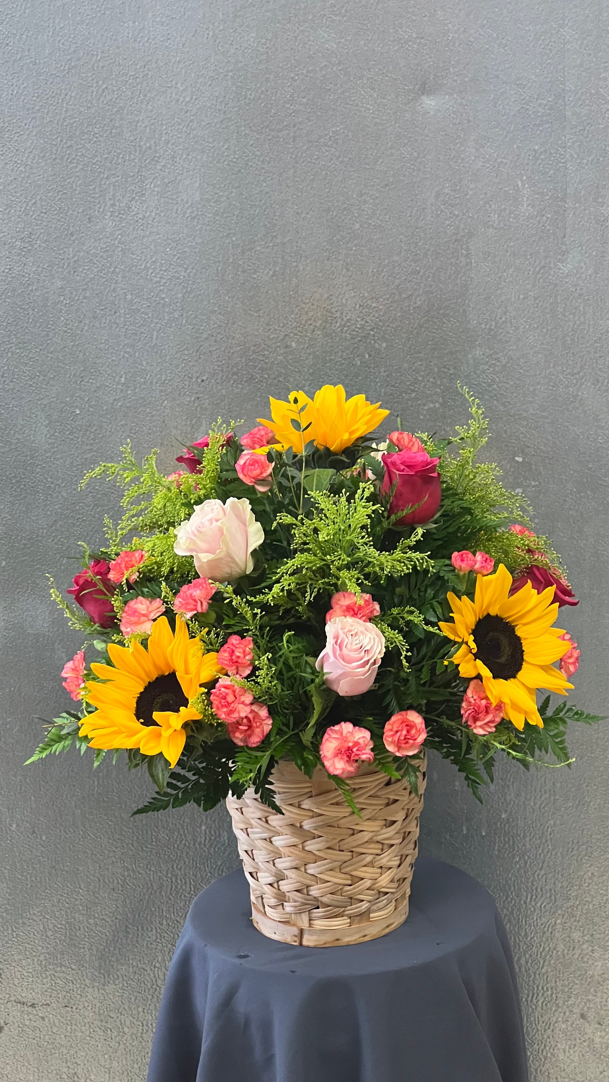 yellow sunflowers, light pink roses,dark pink roses, orange mini carnations,solidago leather leaf