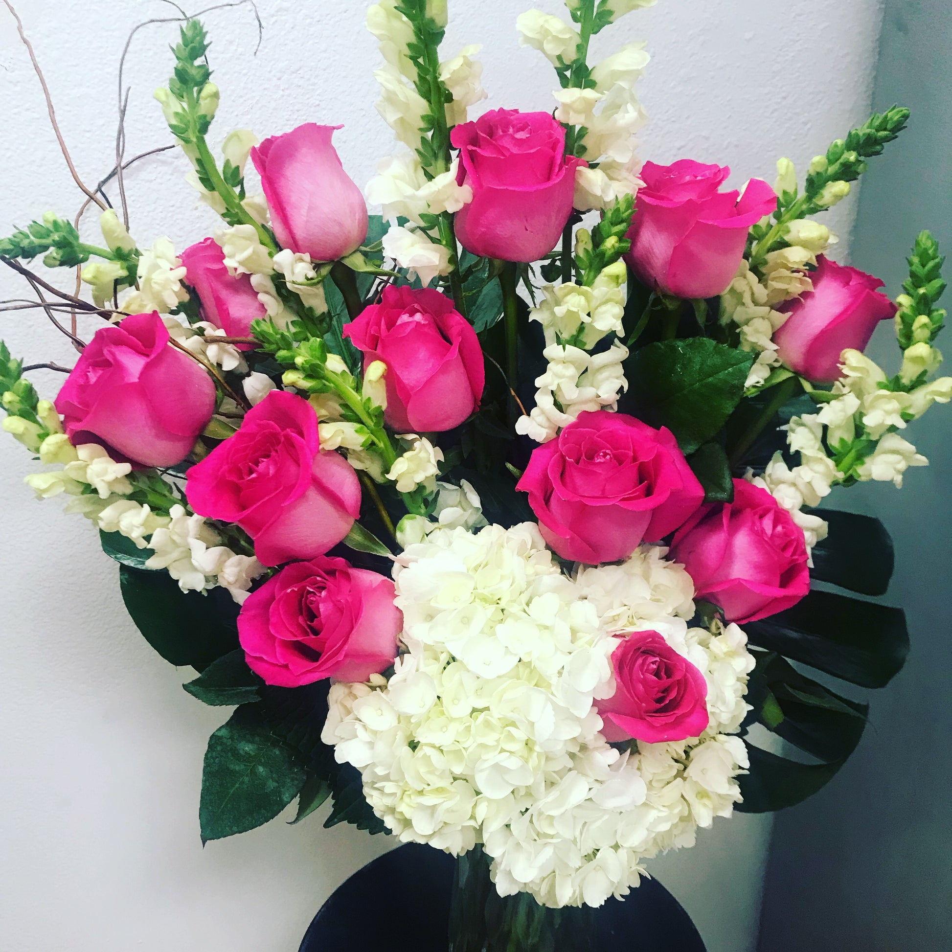 Curly Willow,white snapdragon,white hydrangea,dark pink rose, monsera and lemon leaves