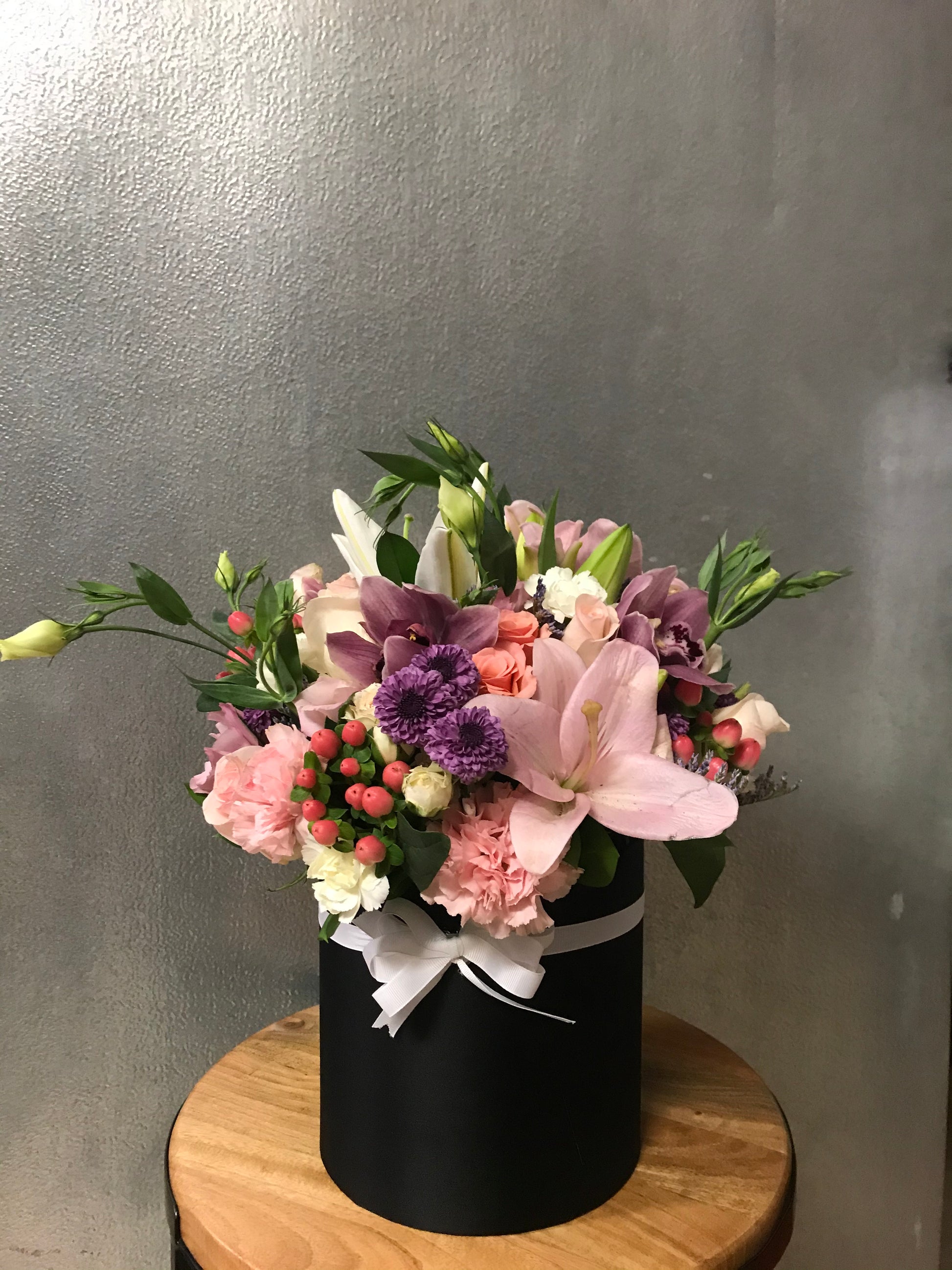 pink and white carnations,coffee bean,purple kermit,pink lily,pink lisianthus,white roses,light pink roses,peach roses,white lily, white sprayt roses, misty blue,lilac, cymbidium orchid &greenery