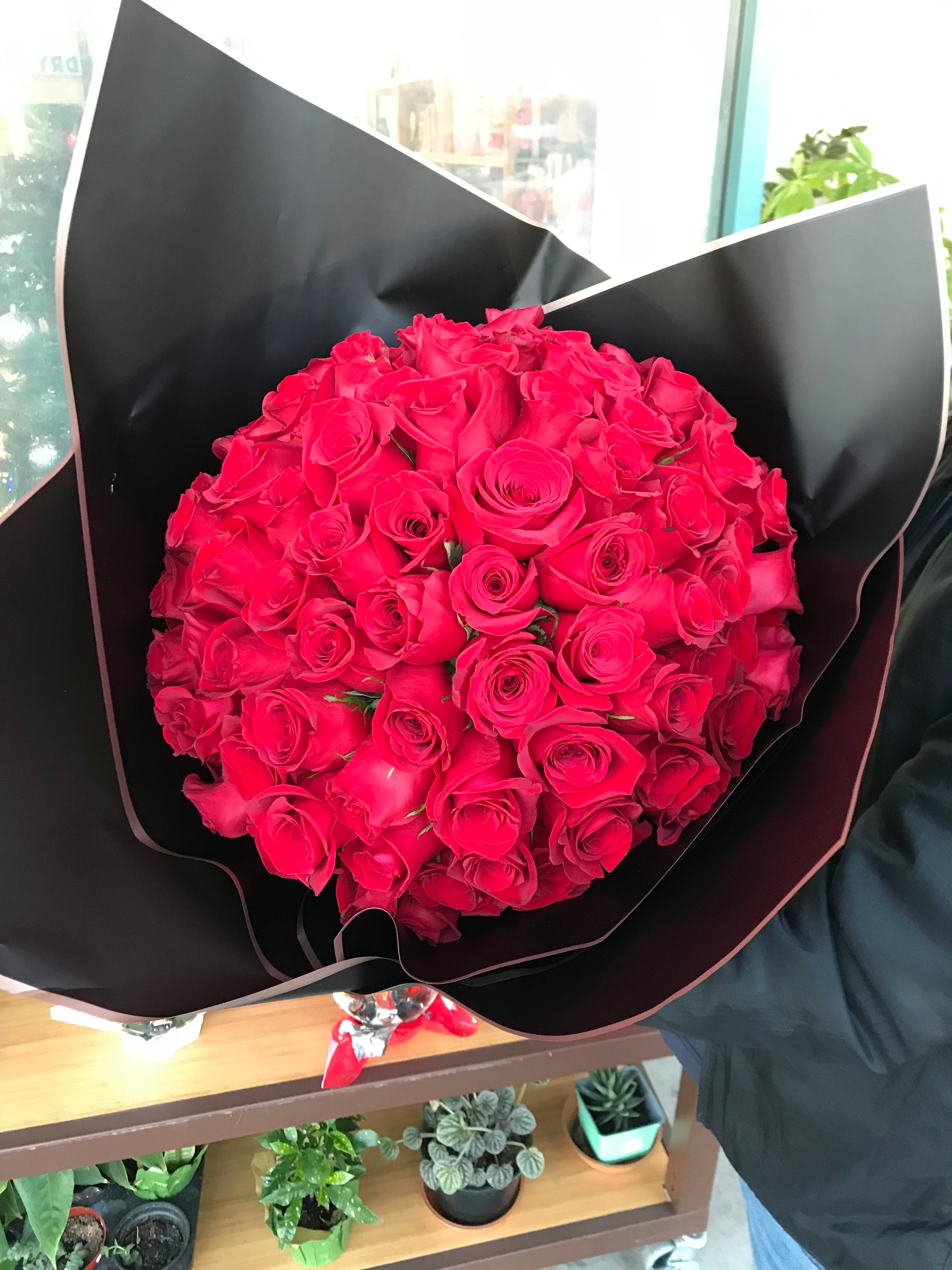 Black wrapping paper bouquet, 100 long-stem Ecuadorian red roses, red bow, and greeting card.
