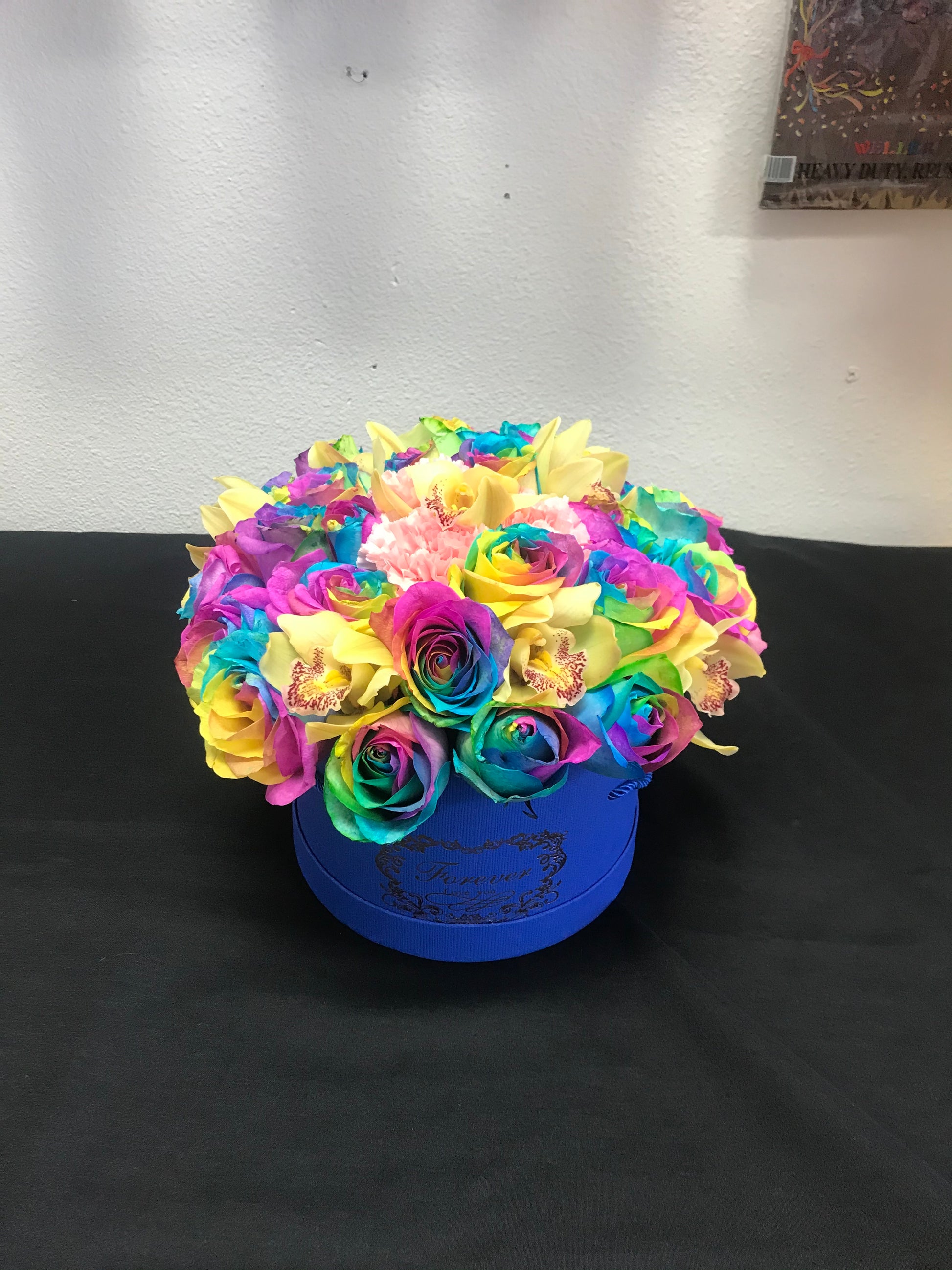 rainbow roses, yellow cymbidium orchids,pink carnations