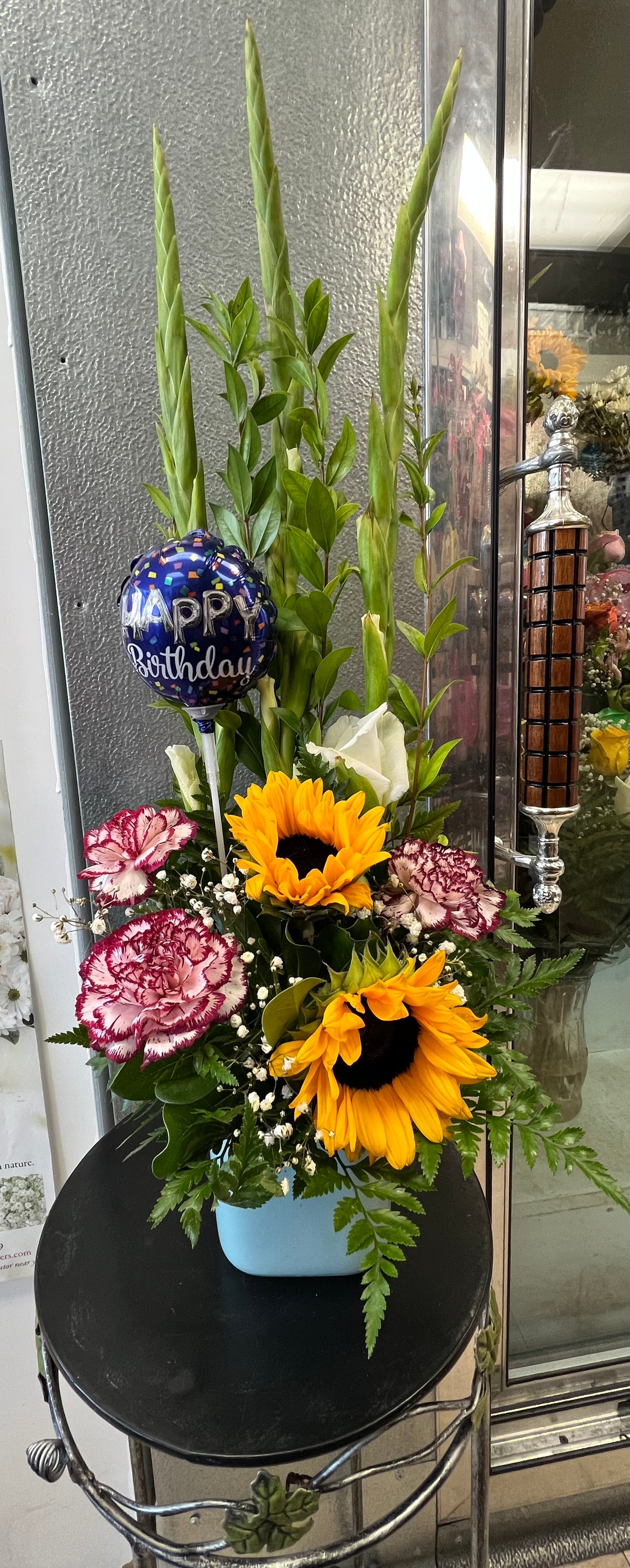 Blue container, 3 red and white carnations,3 sunflowers, 3 white gladiolus, myrtle and leather leaves,1 small stick balloon, greeting card,