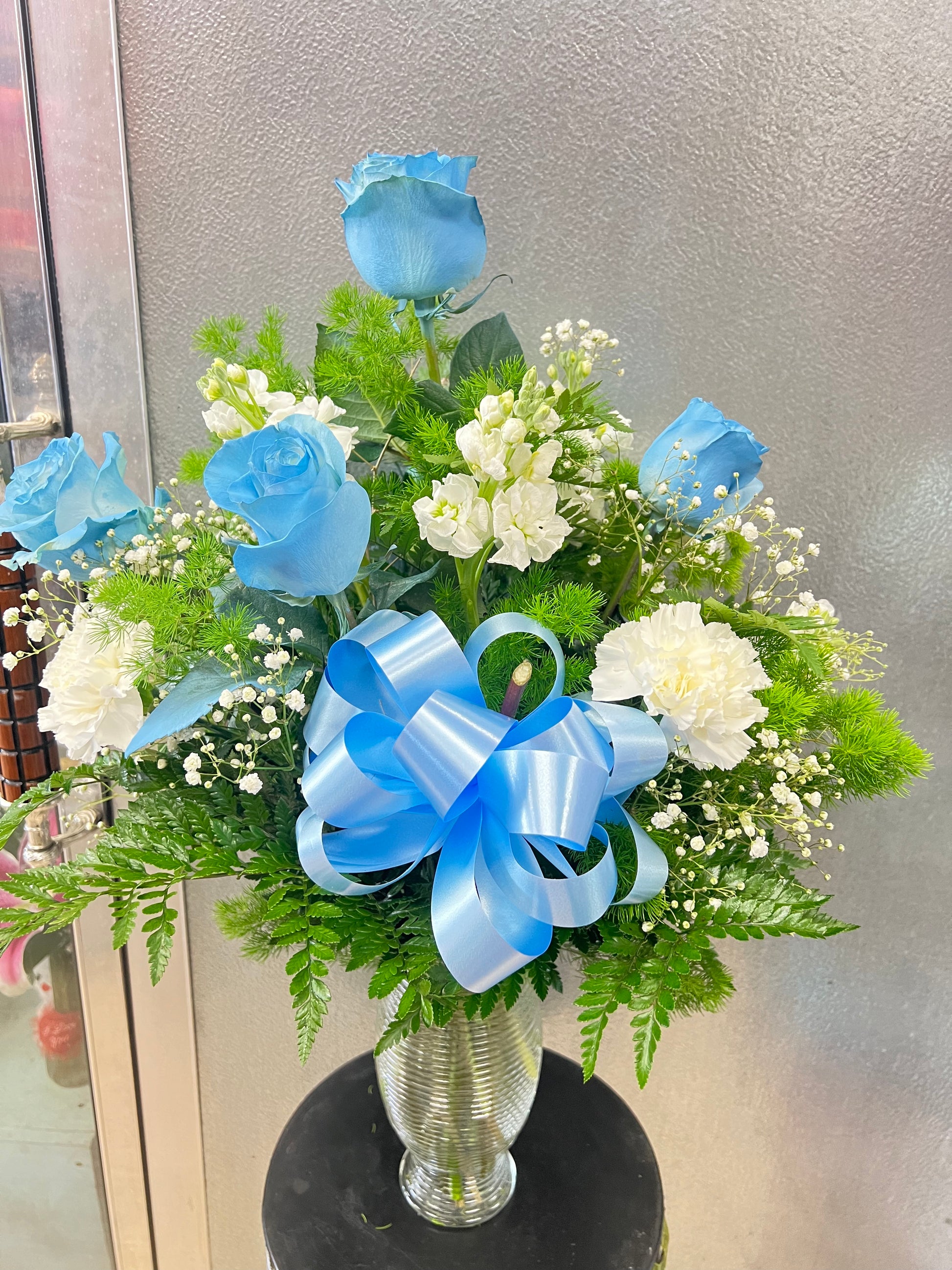 Clear vase, 5 tinted baby blue roses, 4 white stock,4 white carnations, gypsophila, leather and ming fern