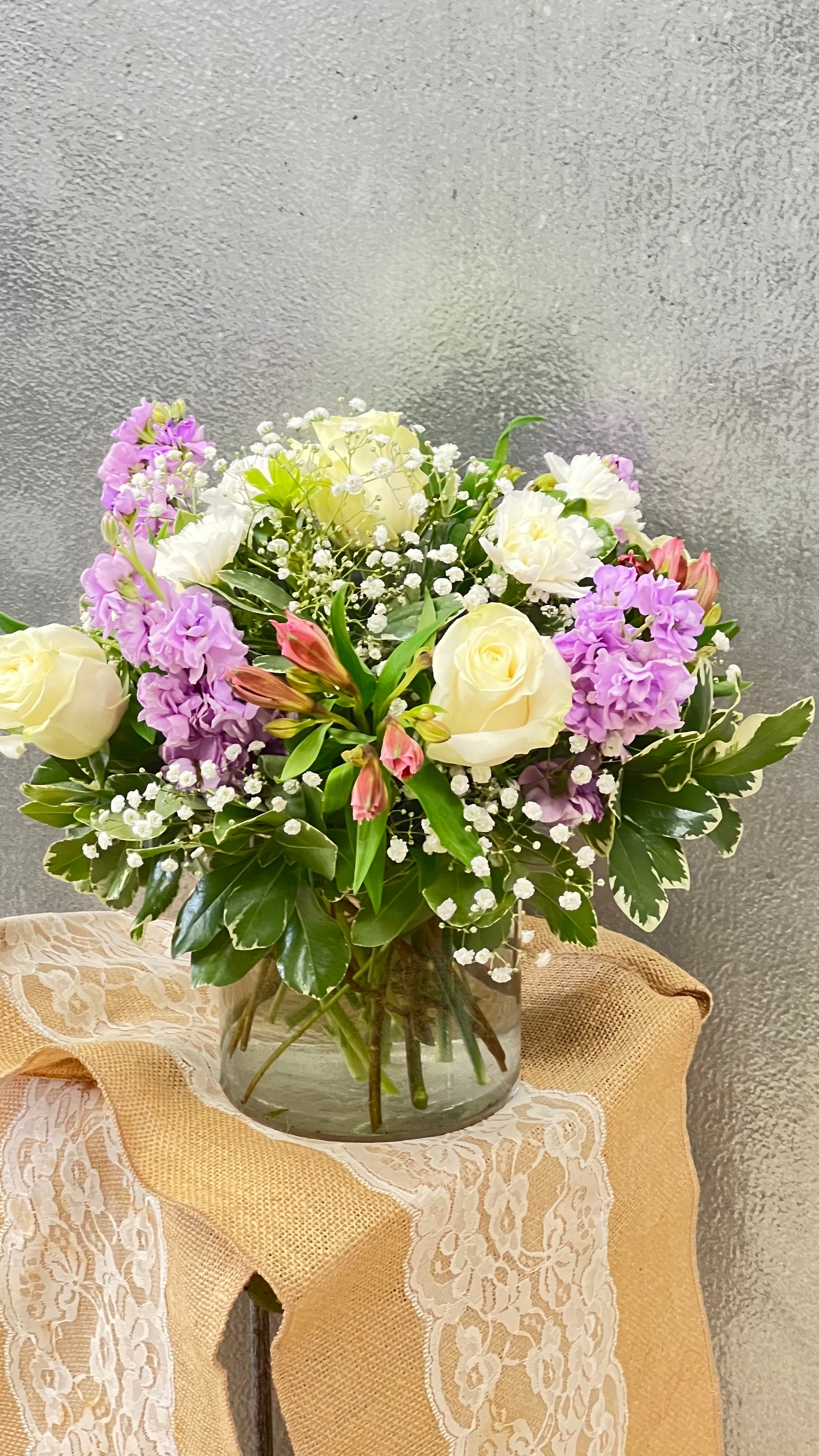 Clear cylinder, 5 white roses, 4 lilac stock, 4 alstroemeria, 4 white carnations, gypsophila, pittosporum.