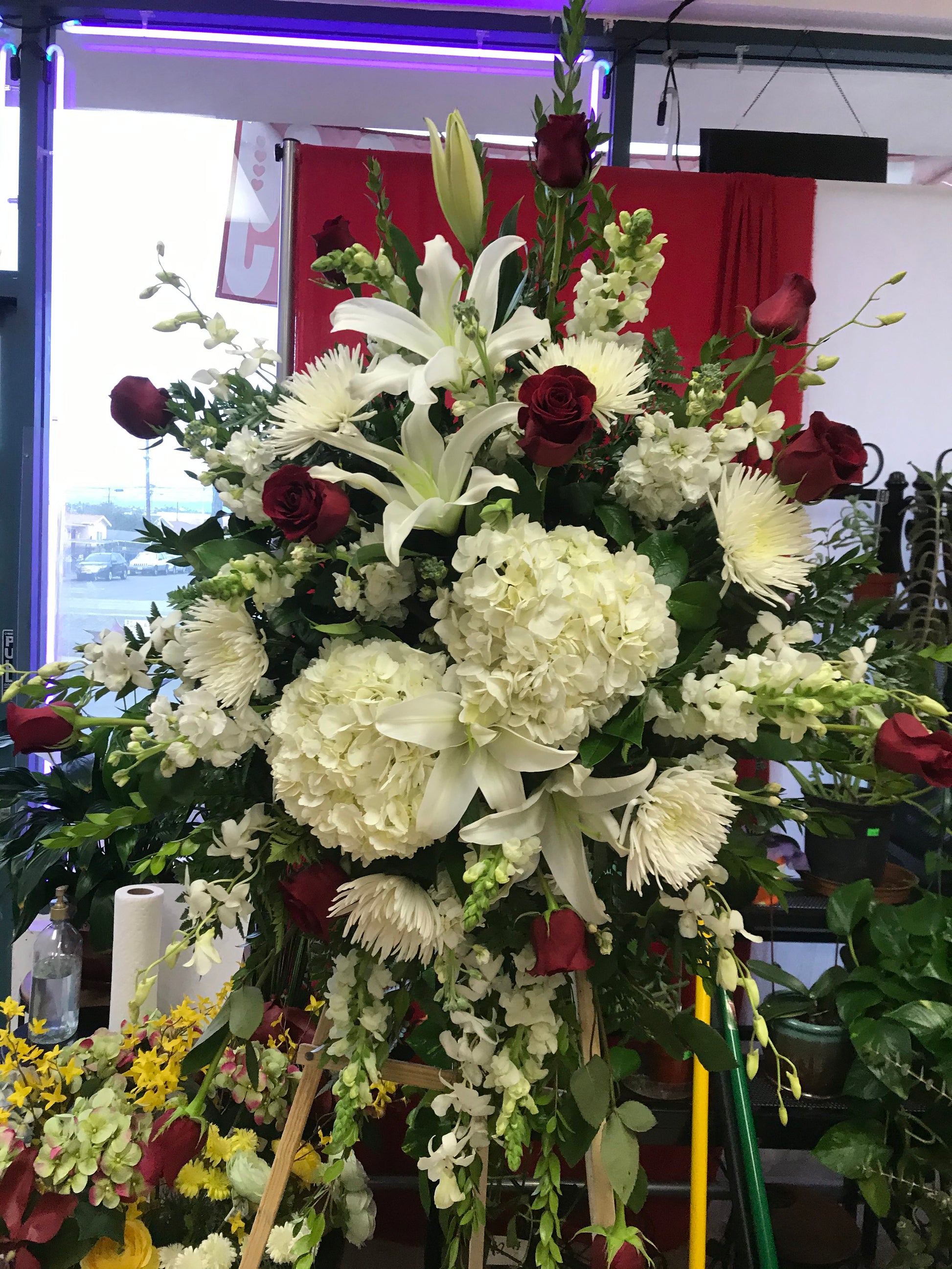Composition: White stock, snapdragons, lilies, orchids, spiders, hydrangea, roses, accented with leather and myrtle leaves